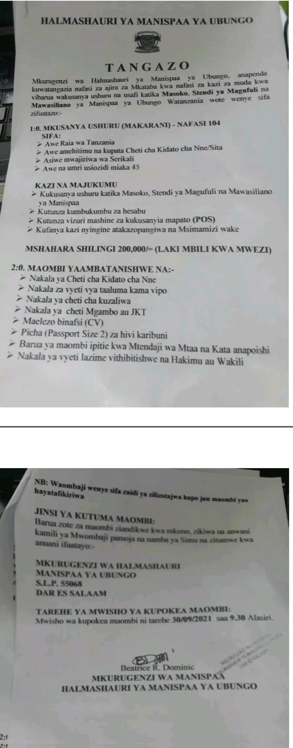 Tangazo la nafasi za kazi 104 Manispaa ya Ubungo